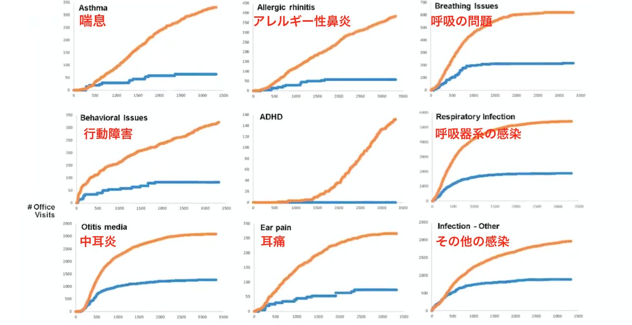 ”ワクチン接種児と非接種児の比較”グラフのオレンジ線はワクチン接種児、青線はワクチン非接種児